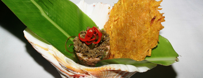 Scallops salteados en salsa de achiote, jerez, cilantro, aji picante cartagenero